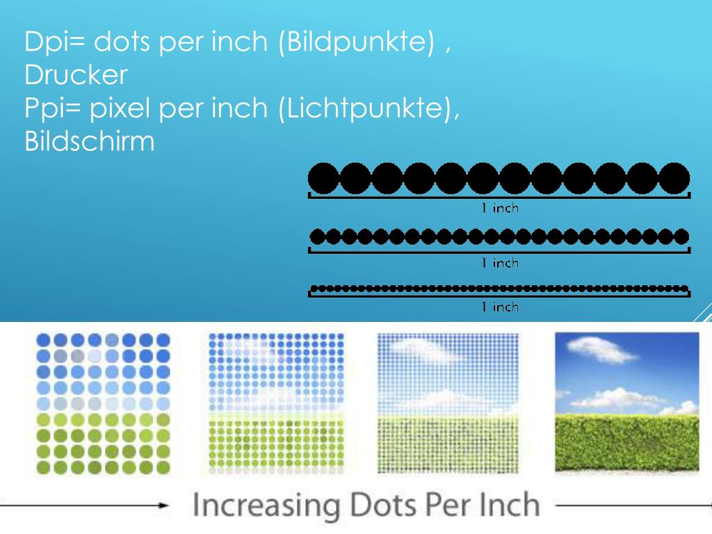 DPI означает «точек на дюйм» и является техническим термином из полиграфии. Термин относится к количеству физических точек печати в печатном документе, плотности точек при печати. Например, если принтер достигает разрешения 1200 x 600 точек на дюйм, это означает, что при печати на одном дюйме распределяется 1200 x 600 точек печати. Размер точек печати различается в зависимости от принтера.
