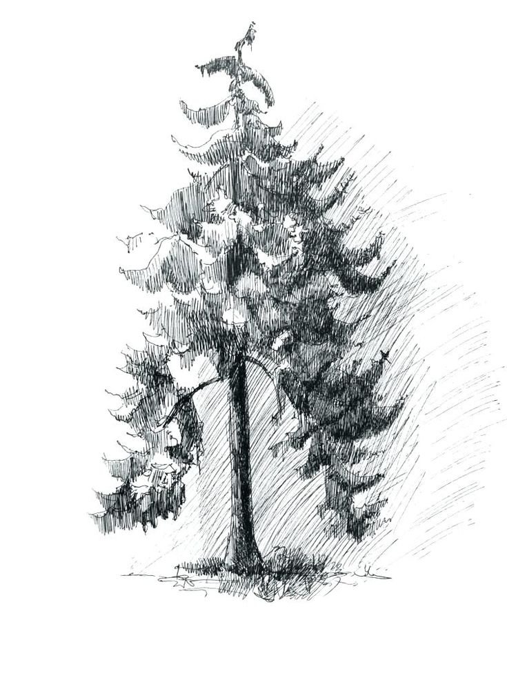 При рисовании елки приходится применять штриховку. Дальние деревья, в которых нельзя разобрать деталей, можно покрывать простым штрихом, самые дальние — вертикальными штрихами. Каждый такой штрих должен как бы подчеркивать характер высоких и сравнительно узких деревьев.