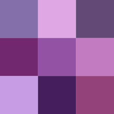 бледно-салатовый и салатовый, зеленый и фиолетовый, лиловый и салатовый, лиловый и фиолетовый, оттенки зеленого, оттенки лилового, пастельные оттенки лилового, салатовый и зеленый, салатовый и лиловый, салатовый и фиолетовый, фиолетовый и лиловый, фиолетовый и салатовый.