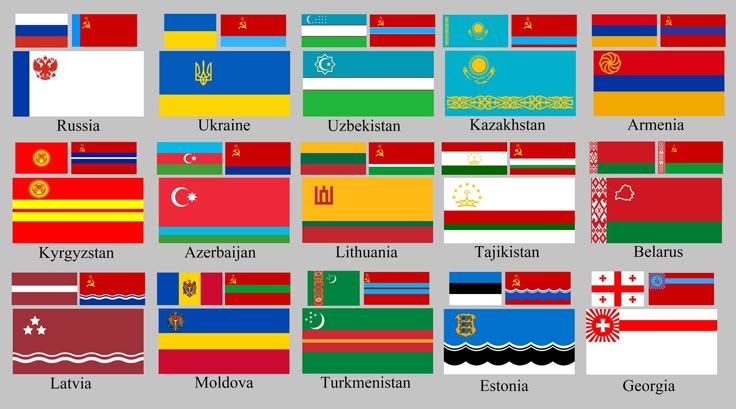 После распада СССР бывшие социалистические республики объединились в Содружество Независимых Государств. Первыми странами, которые в него вошли, были Россия, Беларусь и Украина. Позже к ним присоединились страны Центральной Азии. Главная цель содружества — уважение суверенитета друг друга и сотрудничество. Суверенные страны СНГ с государственными флагами делятся на следующие группы.