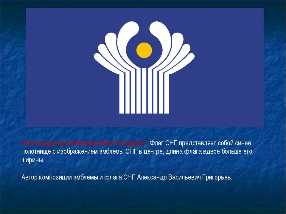 В настоящее время в СНГ входят девять постсоветских государств. Страна-председатель – Беларусь. Цвета ее знамени — красный, зеленый с белым национальным узором.