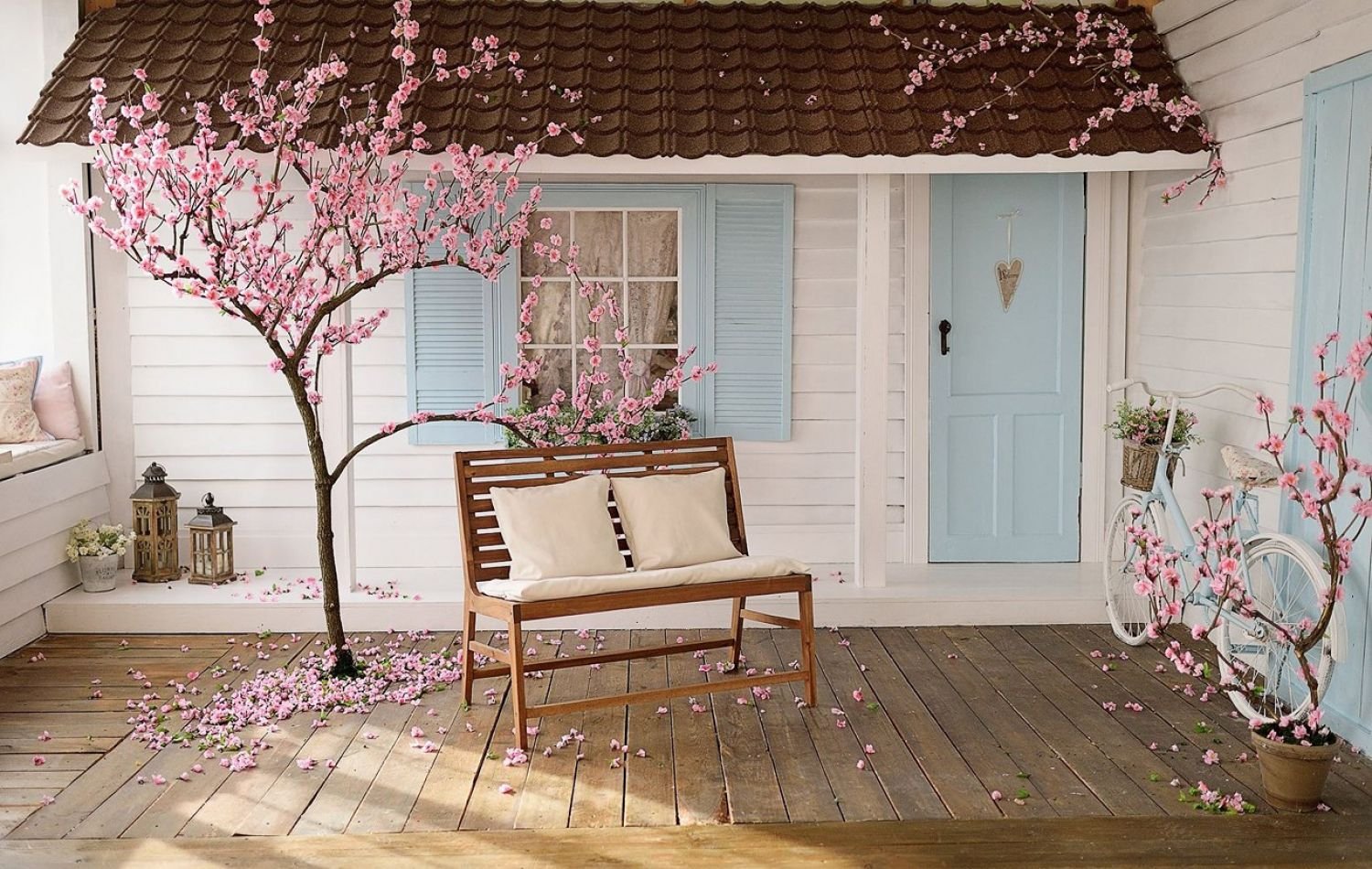 Если такой нет, можно сделать подходящий фон, например, из досок. Зону украшают напольными шарами, цветами, драпировкой из ткани или другими аксессуарами.
