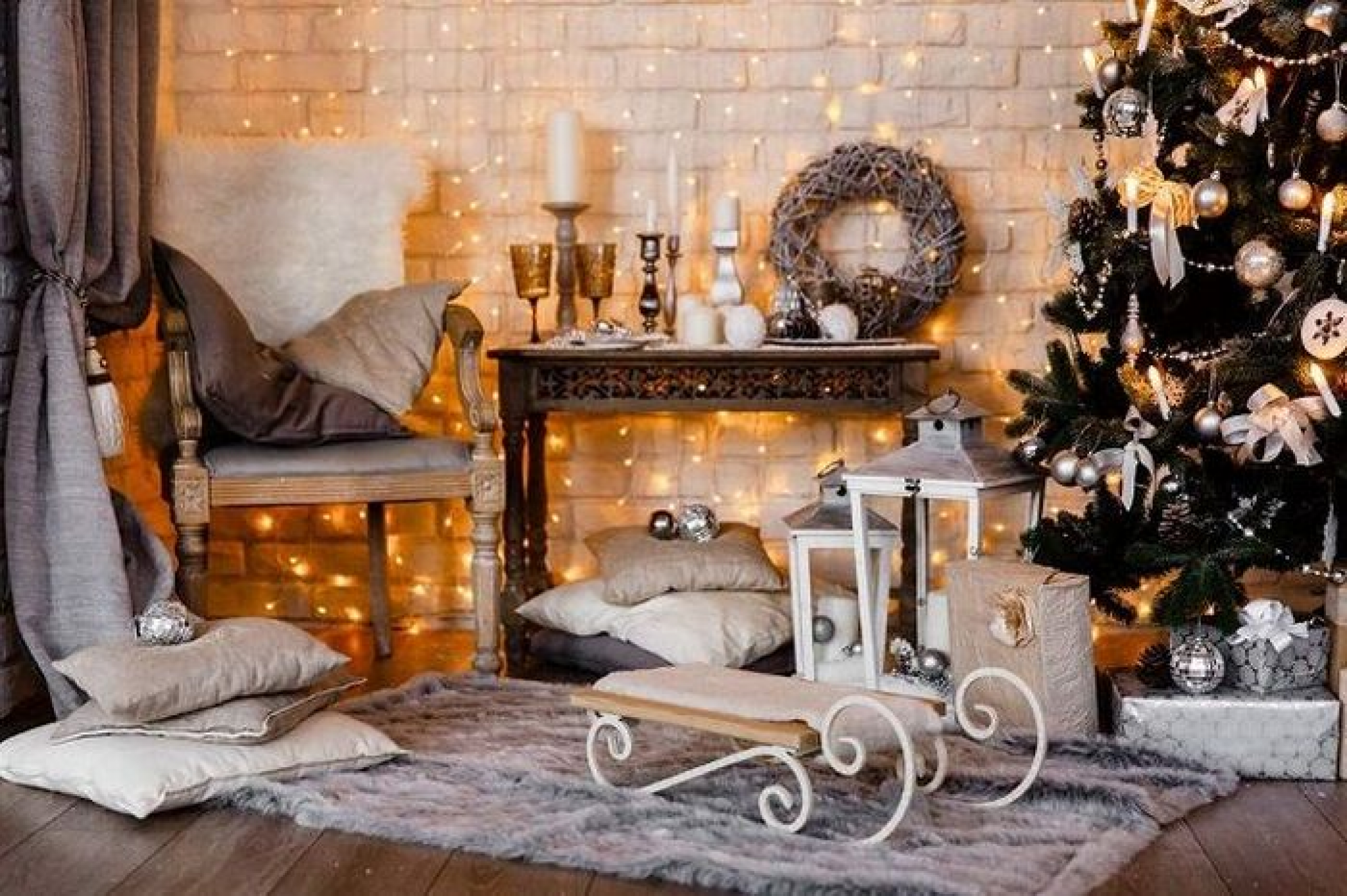 Можно надуть шары разных размеров. Если вы используете шары с гелием, привяжите к каждому груз и поставьте на пол. - Ткани. Подойдут тюль и даже шторы. На фотографиях хорошо выглядят мерцающее полотно золотого и серебряного цветов.