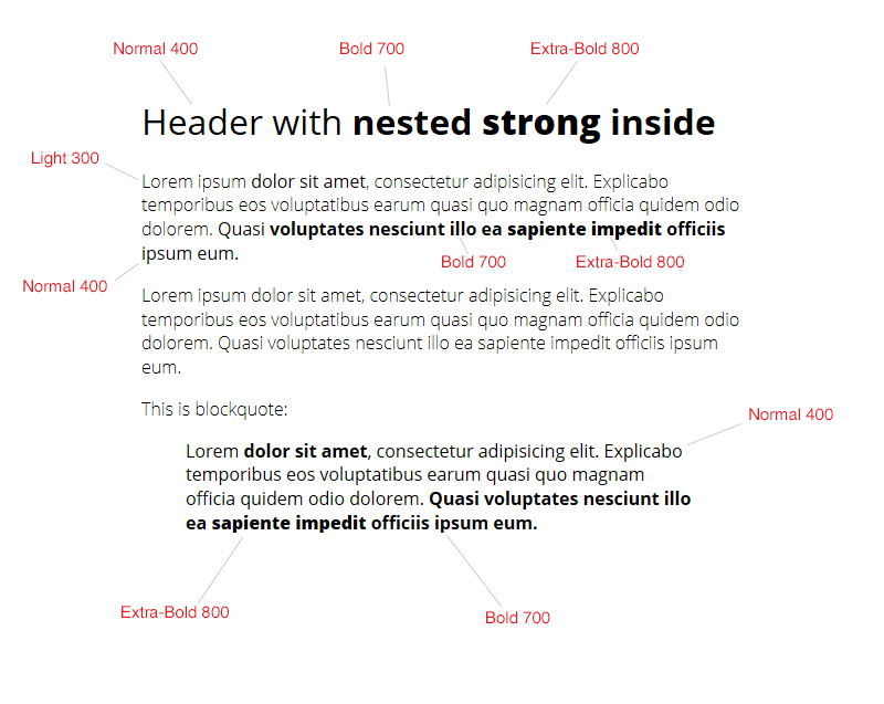 А нам хочется, чтобы у strong и b для основного текста было Normal 400, для цитат и заголовков — Bold 700, а для промо блока — Extra-Bold 800. Это сохранит контраст между жирным и нежирным текстом примерно равным во всех случаях.