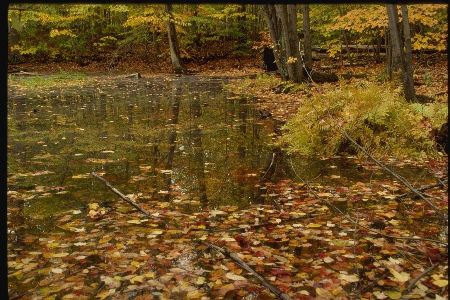 пузырьков дождя и листьев в грязной луже во время осеннего дождя в лесу, Фотография, картинки, изображения и низкий бюджет. Рис. ESY-047690457