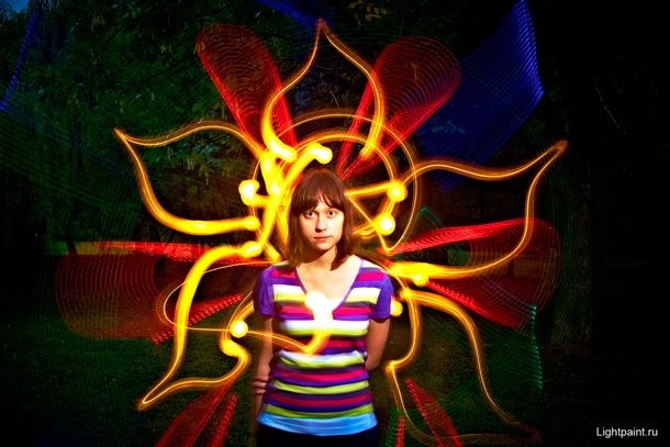 Важное замечание: если вы собрались заниматься «рисованием» на улице, позаботьтесь, чтобы источники света не конкурировали по «силе» с вашими «световыми инструментами», иначе «светоживопись» будет выглядеть очень невзрачно.![]()