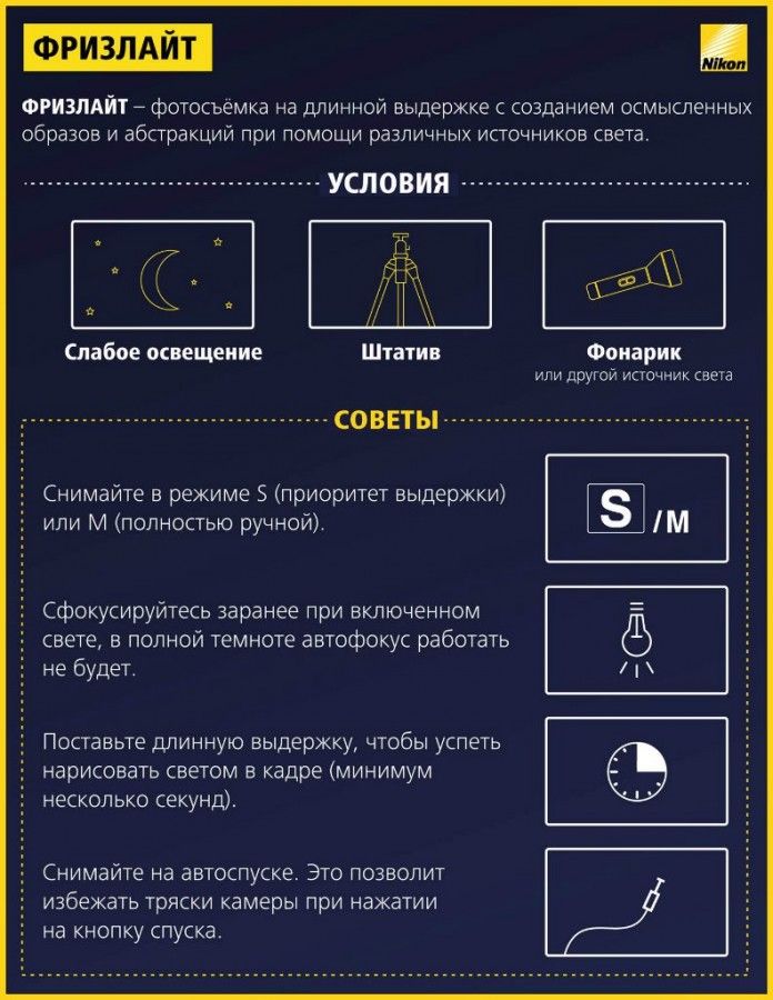 При ночной съемке используйте штатив и попробуйте снимать с выдержкой 4 секунды. Вы увидите, что движение объекта захвачено вместе с некоторыми световыми следами.