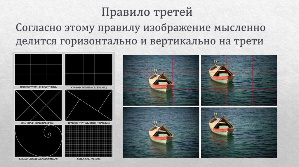 Этот простой метод хорошо работает, позволяя избегать скучных портретов и натюрмортов с расположенными по центру моделями и объектами. В пейзажах, как правило, на указанных линиях помещают горизонт.