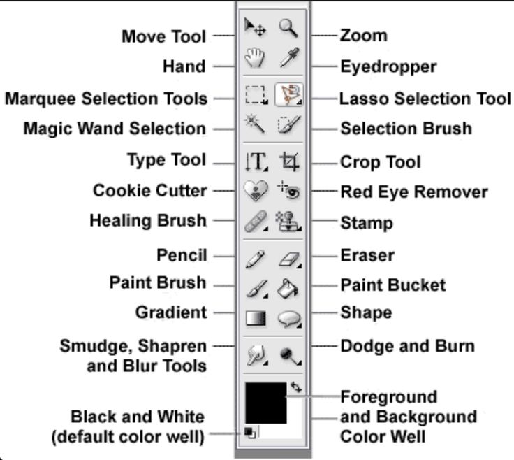 Вот краткий обзор каждого инструмента, который вы найдете на панели инструментов, а также краткое описание того, для чего используется каждый инструмент. Конкретные инструменты будут более подробно рассмотрены в других уроках. Я перечислил инструменты в том порядке, в котором они отображаются на панели инструментов, начиная с инструментов «Перемещение» и «Выделение» вверху.