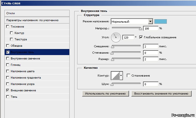 ΠΠ·ΠΌΠ΅Π½Π΅Π½ΠΈΠ΅ ΡΠ²Π΅ΡΠ° ΠΈΠΊΠΎΠ½ΠΎΠΊ Π²Β ΠΠ°ΡΠ°ΠΌΠ΅ΡΡΠ°Ρ Π½Π°Π»ΠΎΠΆΠ΅Π½ΠΈΡ/Blending OptionsΠΡΠ΅Π½Ρ ΠΏΠΎΡ ΠΎΠΆ Π½Π°Β ΠΠ½ΡΡΡΠ΅Π½Π½Π΅Π΅ ΡΠ²Π΅ΡΠ΅Π½ΠΈΠ΅/Inner Glow. Π Π°Π·Π½ΠΈΡΠ°Β Π»ΠΈΡΡ Π²Β ΡΠΎΠΌ, Π³Π΄Π΅ ΡΠΎΠ·Π΄Π°Π΅ΡΡΡ ΡΡΡΠ΅ΠΊΡΒ β Π²Π½ΡΡΡΠΈ ΠΎΠ±ΡΠ΅ΠΊΡΠ° ΠΈΠ»ΠΈ Π·Π°Β Π΅Π³ΠΎ ΠΏΡΠ΅Π΄Π΅Π»Π°ΠΌΠΈ.
