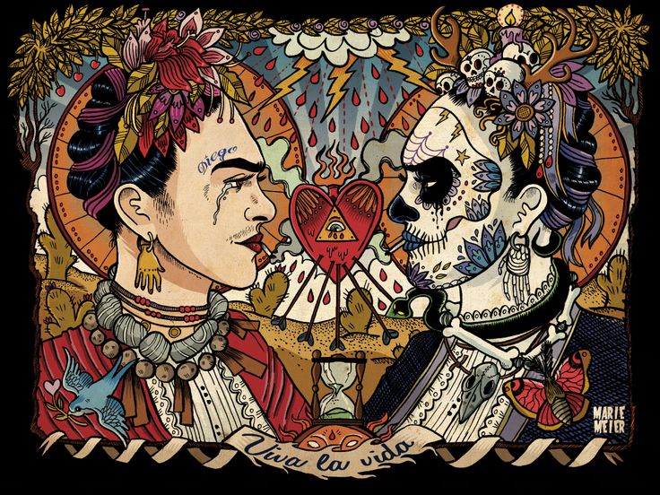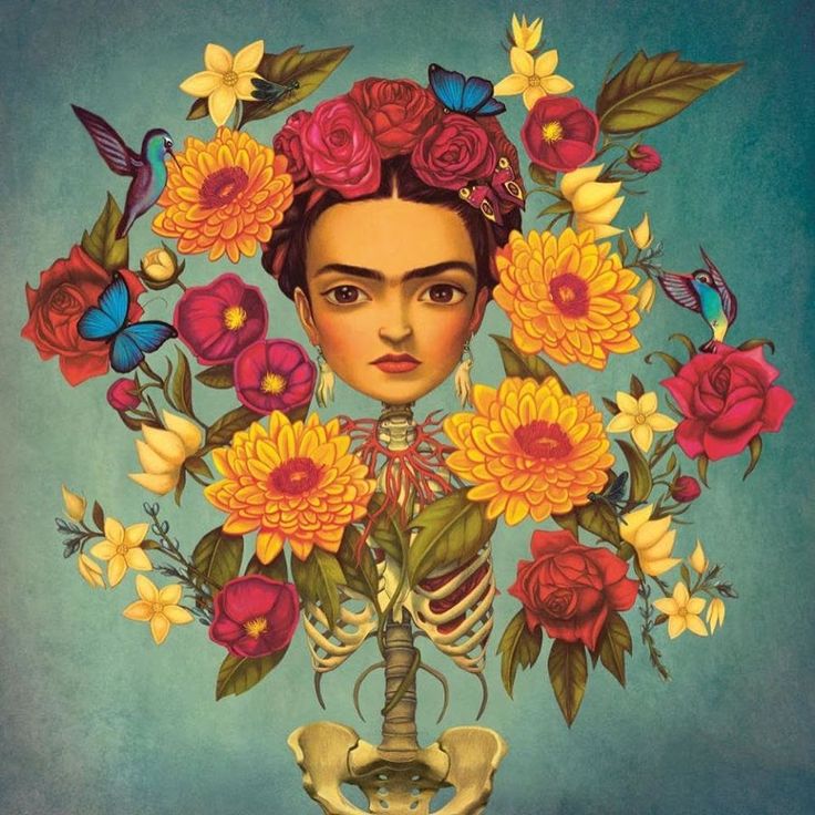 Вообще, в творчестве мексиканской художницы намешано много разного и всякого — тут и сюрреализм, и мурализм, и символизм, а кое где и элементы народного творчества — всякие мексиканские цветуечки и узоры.