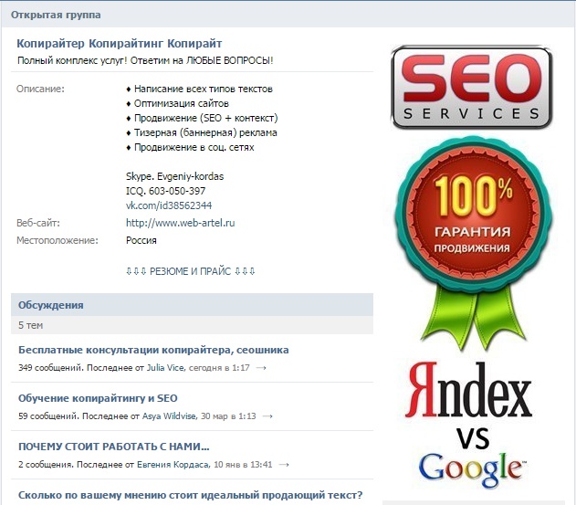 Сообщество Копирайтер Копирайтинг Копирайт это группа человека, который занимается раскруткой сайтов. Но тут можно найти очень много интересного и полезного – советы, как написать продающий текст, советы по СЕО, раскрутке сайта и многом другом. Группу можно добавить в закладки и иногда почитывать – реально много полезного материала!