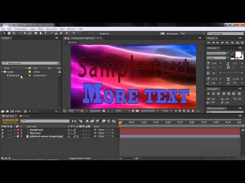 Сначала создадим шесть текстовых слоёв «www.», «i», «x», «b», «t», и «.com» в середине композиции, на светлой полосе бэка (background, задний план). Текстовый инструмент вызывается командой Ctrl+T, либо нажатием соответствующей кнопки на панели инструментов. После создания первого слоя нажмите Ctrl+6 тем самым вы получите доступ к панели Character, где регулируются любые параметры текста. Желательно пользоваться направляющими guides для выравнивая наших слоёв, которые работают так же, как в Photoshop. Не забываем следить, чтобы CTI находился на нулевом кадре, случайно не сдвинувшись (не забываем об упомянутой аккуратности).