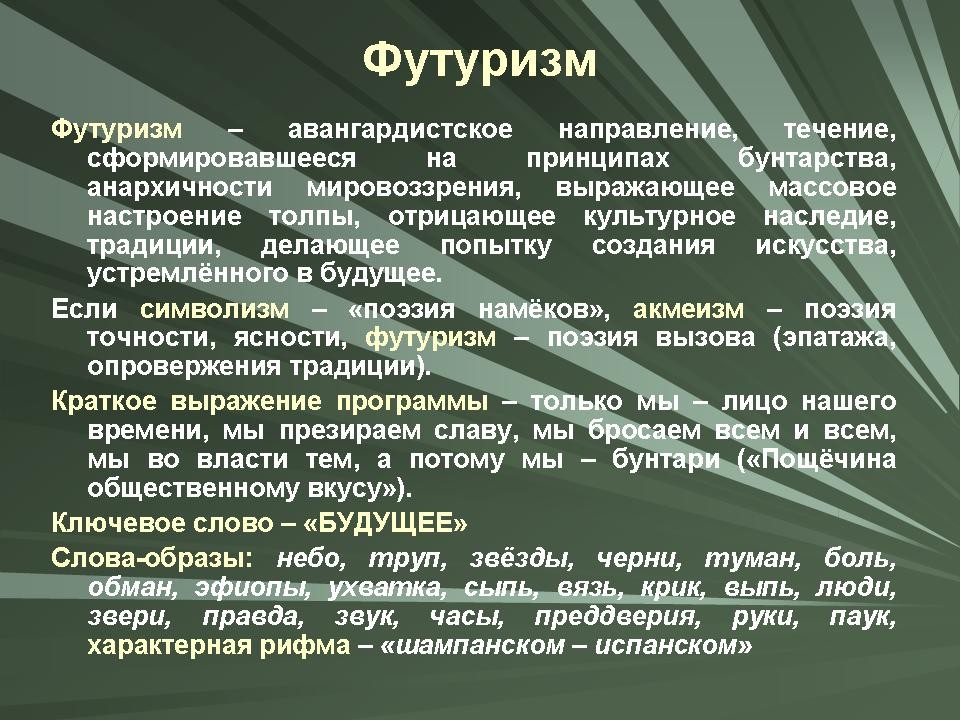 — Футуризм, зародившийся в Италии, быстро нашёл отклик в сердцах русских поэтов. «Манифест футуризма», написанный Ф. Маринетти, провозгласил основные принципы данного направления: смелость, дерзость, бунт.