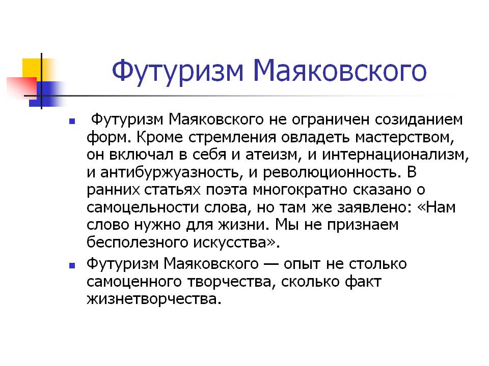 Однако многое взяв у футуризма, Маяковский далеко ушел от него и сумел создать свой собственный неповторимый стиль.