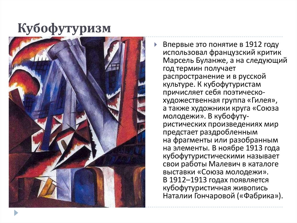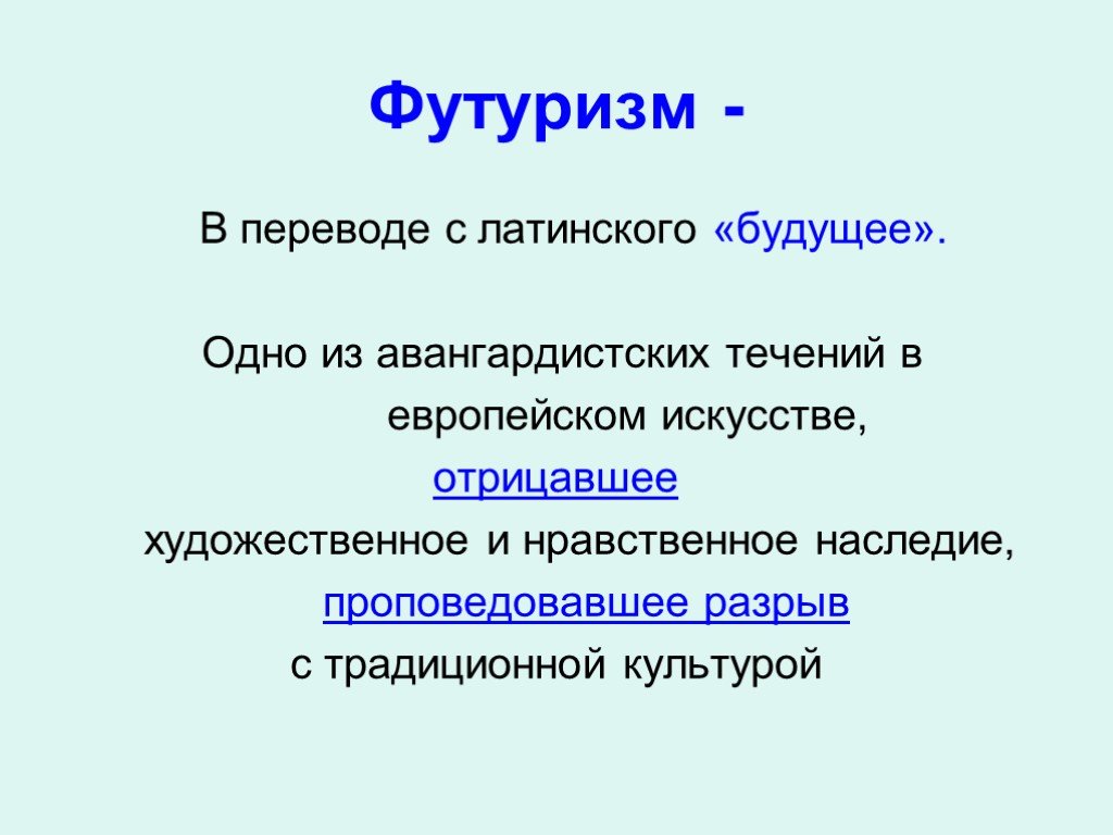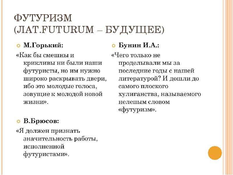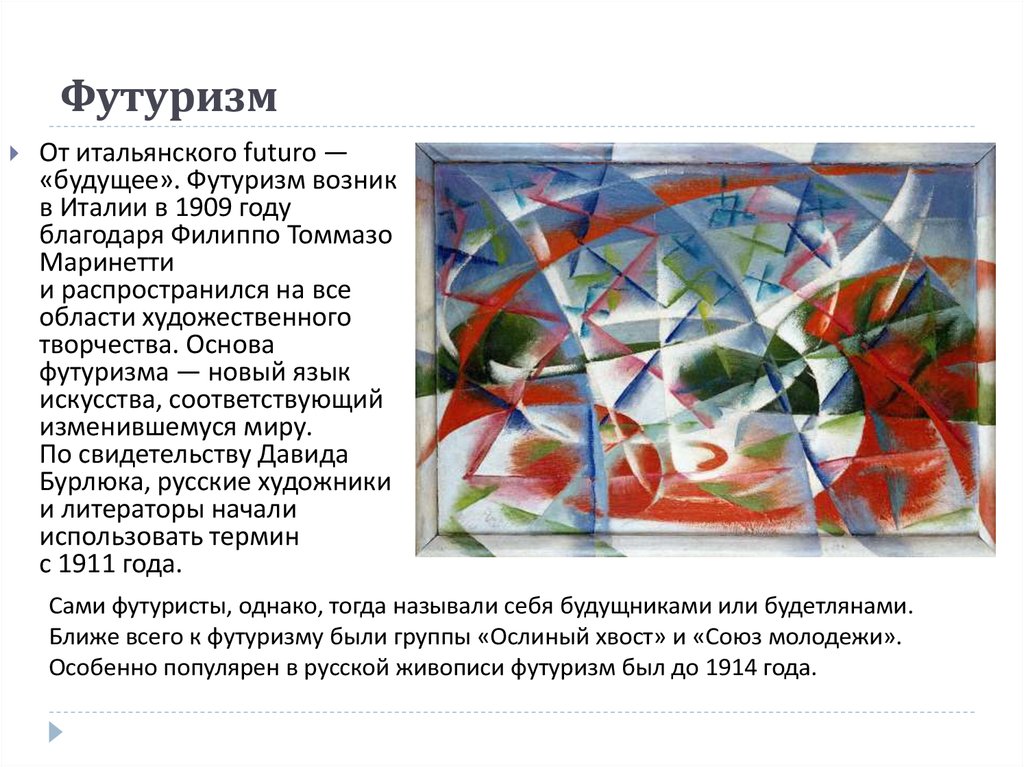 Футуризм возник как одно из направлений русской поэзии рубежа веков. Называя себя единственными поэтами будущего (будетлянами), футуристы заявили об окончательном и полном разрыве со всеми традициями, резко противопоставили себя другим течениям (символизму, акмеизму) и провозгласили задачу создания нового искусства XX века, Они возмущали общественное мнение максимализмом своих литературных манифестов.