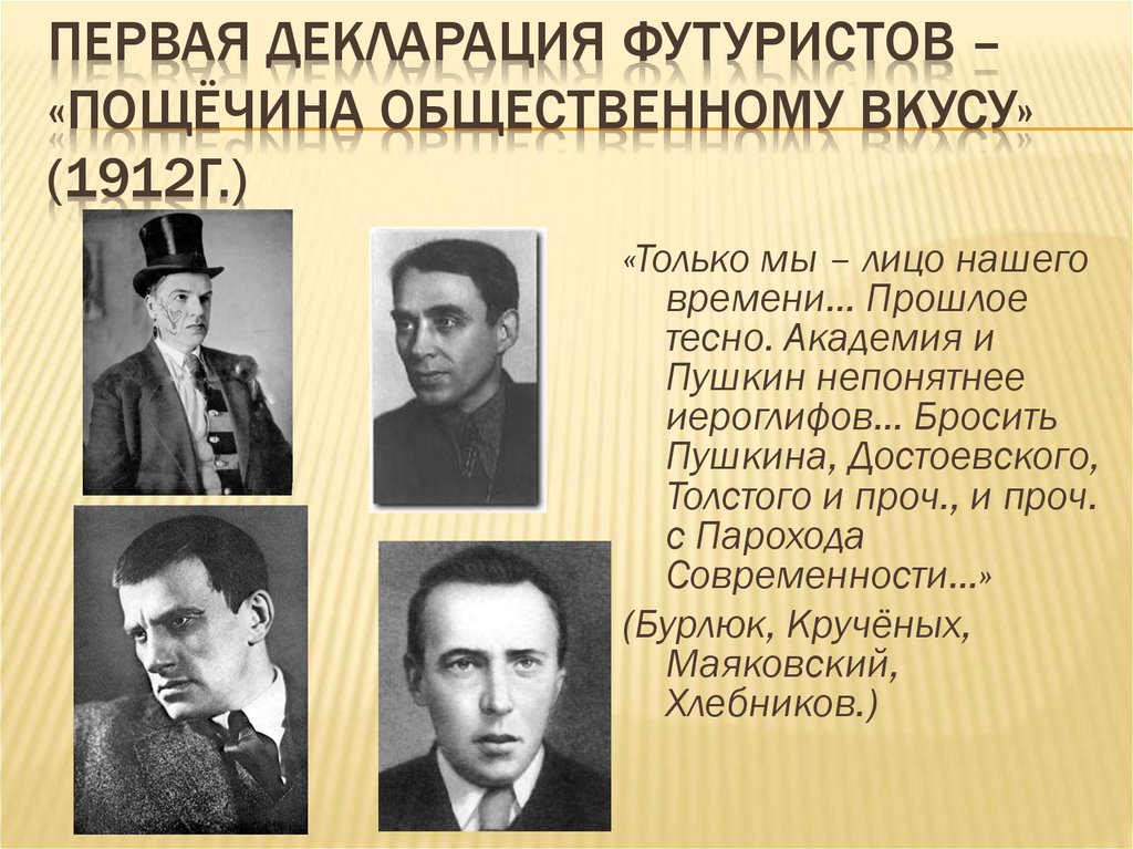 В манифесте с вызывающим названием «Пощечина общественному вкусу» они призывали «сбросить Пушкина, Достоевского, Толстого с парохода современности». Футуристы шокировали названиями своих сборников («Дохлая луна», «Рыкающий Парнас» и др.). Их вечера носили шумный, скандальный характер. Они нещадно высмеивали пошлость, мещанство, обывательское отношение к жизни. Все эти внешние признаки революционности пришлись по вкусу молодому Маяковскому.