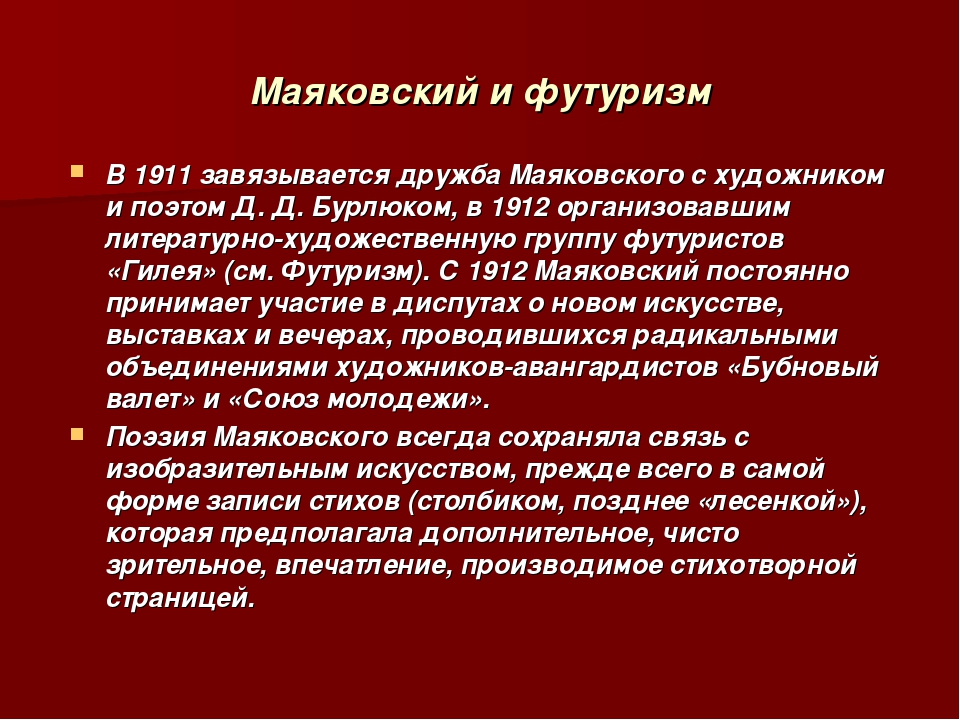 Владимир Владимирович Маяковский — одна из самых ярких фигур не только русского футуризма, но и всей русской поэзии. Молодой, революционно настроенный Владимир Маяковский присоединился к футуристам в 1912 году.