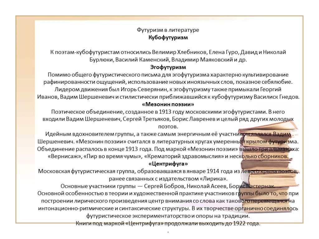 Чтобы лучше разобраться в принципах этой литературной школы, появившейся одновременно в ряде стран, обратитесь к первоисточникам, прежде всего к манифестам итальянского футуриста Маринетти, которые были одновременно напечатаны и в книге Маринетти «Футуризм», и в книге Таставена «Футуризм» (на пути к новому символизму), тоже появившейся в 1914 году. Эти манифесты не только характеризуют воинственный национализм агтресивной молодой буржуазии Италии, колыбели фашизма, но и прекрасно выявляют основы футуристической чувствительности, футуристического лиризма, футуристической поэтики, футуристически-новаторской оригинальности.