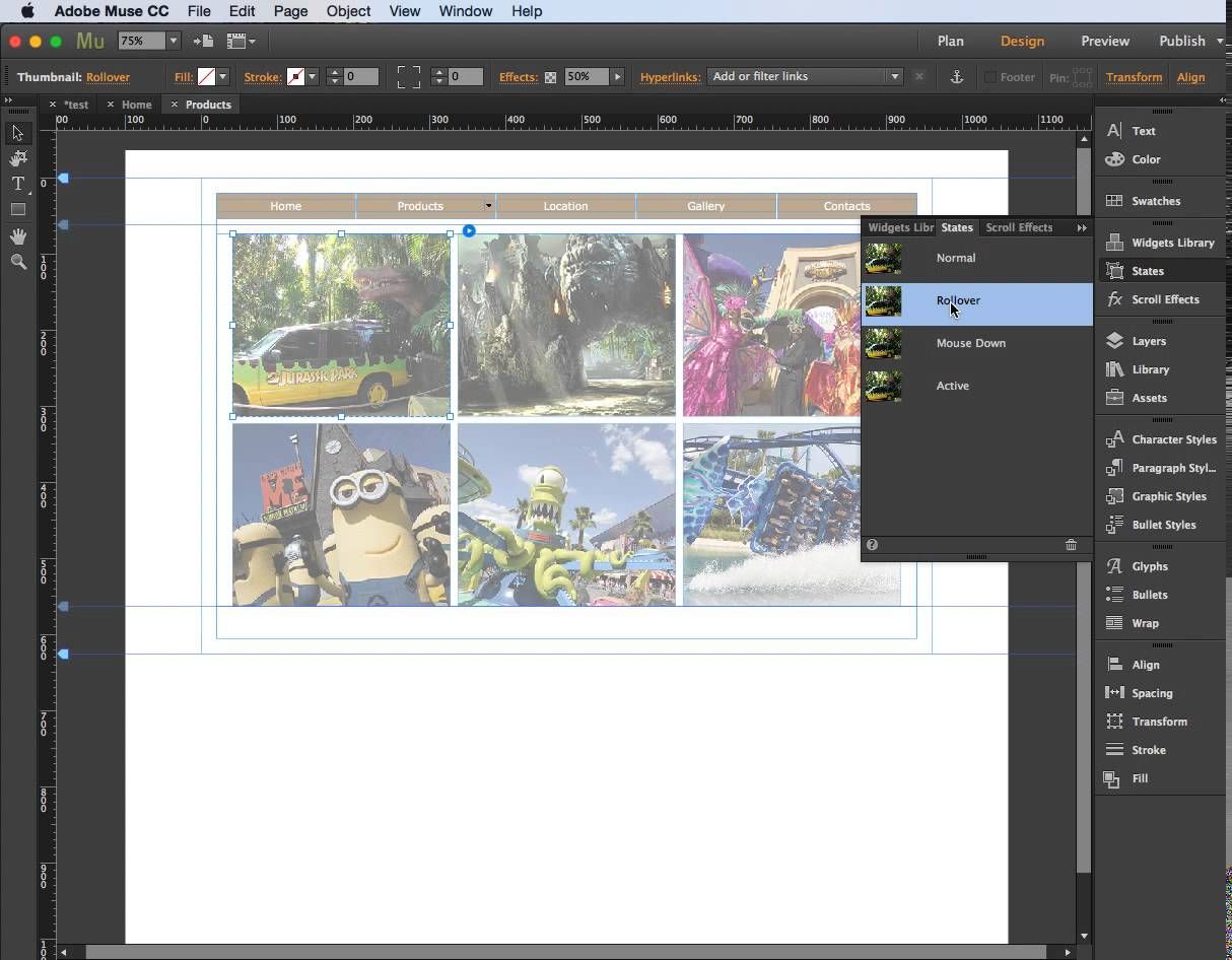- В Adobe Muse выберите Окно > Интервал , чтобы открыть панель «Интервал».
