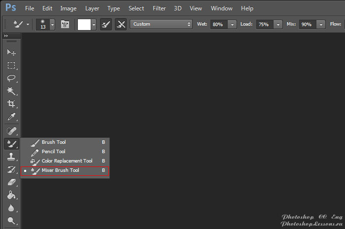 Режима окрашивания (Painting Mode), непрозрачности (Opacity) и нажатия (Flow) нет в панели кистей, но все же они одинаково важны. Эти настройки автоматически высвечиваются в верхней панели инструментов при обращении к инструменту кисть (В).