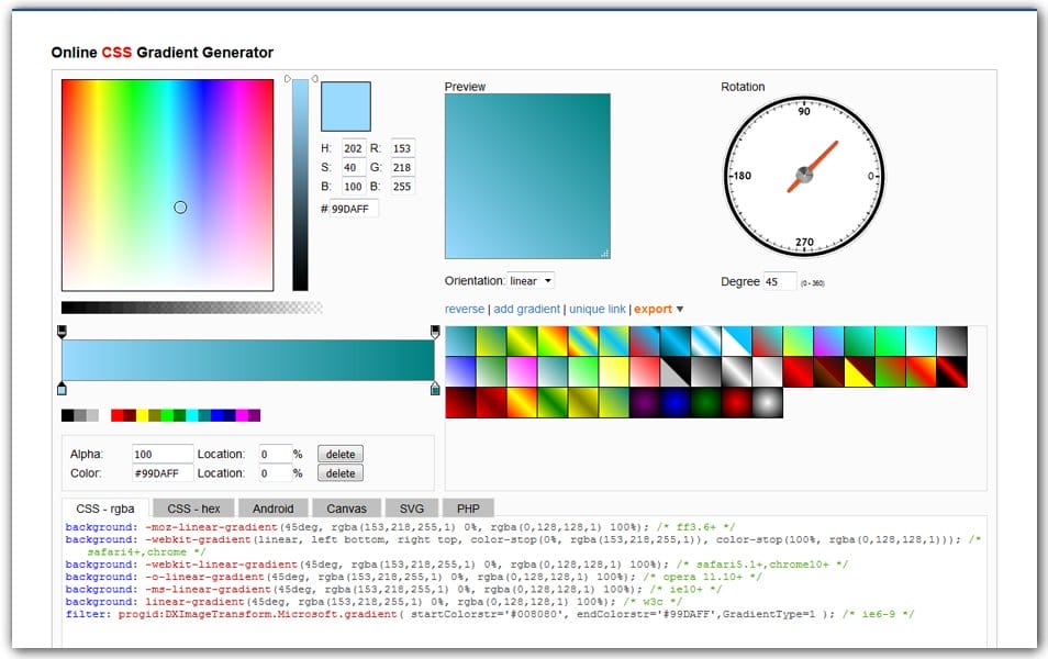 Генератор градиента CSS от HTMLlion — это самый простой и простой генератор градиента для вас. он обеспечивает чистый и простой интерфейс с удобными ползунками и выбором цвета. Он также предоставляет несколько совместимых с браузером кодов градиента CSS.