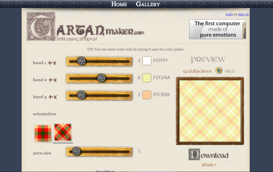 Если вам нравятся узоры из пересекающихся горизонтальных и вертикальных окрашенных линий, то инструмент Tartanmaker как раз для вас. Выберите три цвета, ориентацию, размер «нити» и жмите кнопку «Make It», чтобы получите собственный вариант шотландской клетки (тартан). Здесь имеется галерея с узорами, которые создали другие пользователи. Открывайте и скачивайте их бесплатно.