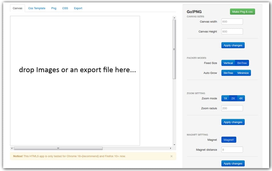 Переходим на страницу онлайн генератора спрайтов CSS Sprites Generator и загружаем заранее подготовленные файлы нажатием конки Choose files или простым перетаскиванием на страницу методом Drag & Drop.