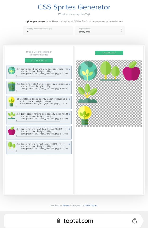 Для ручного объединения элементов в один файл потребуется графический редактор и немного времени. Затем необходимо определить относительные координаты каждого элемента в спрайте и написать свойства позиционирования для файла стилей. Я предлагаю облегчить задачу благодаря онлайн инструменту.
