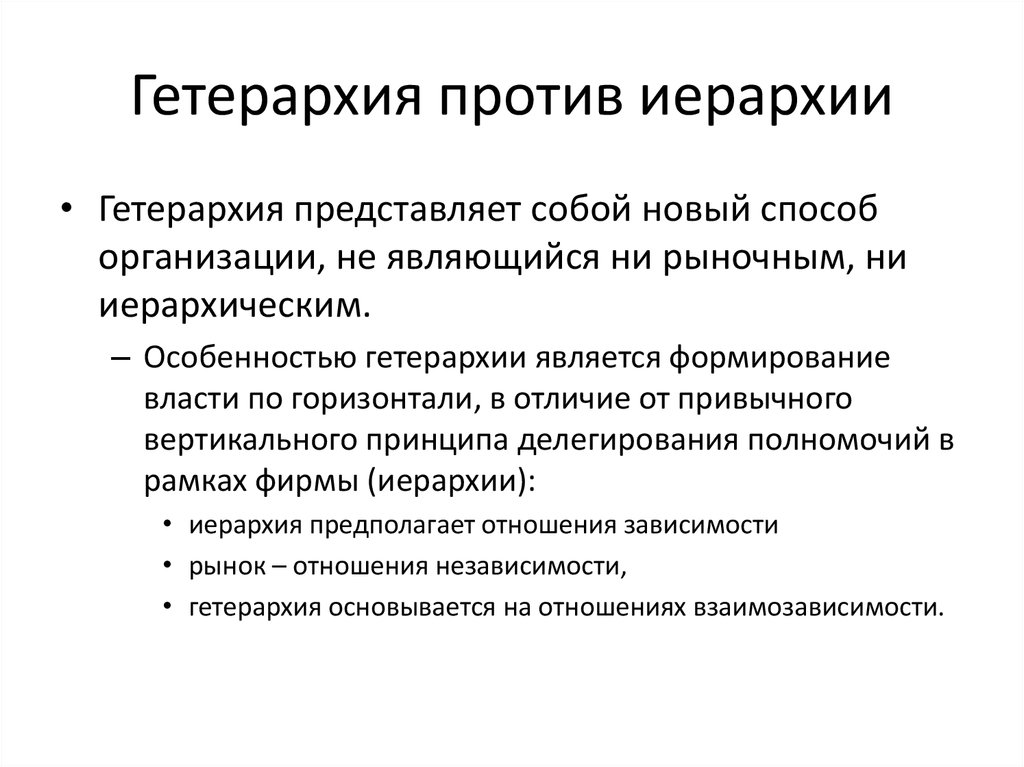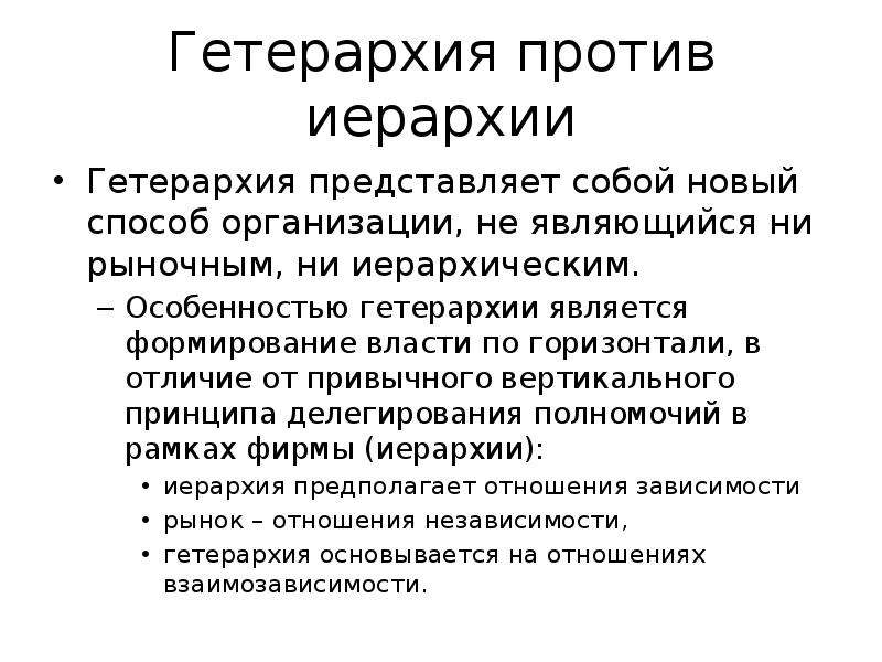 Слово «гетерархия» обозначает «другая власть», то есть иная, отличная от однородной. Она возникла как решение в условиях неопределенности, с которой невозможно справиться тяжеловесной системе.