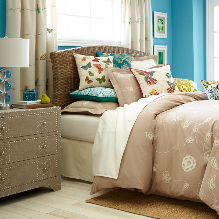 При выборе стоит обращать внимание на фактуру: бежевый напоминает о земле и древесной коре, поэтому предпочтительны матовые, шероховатые материалы, фактурная ткань. Голубой более универсален: отлично смотрятся, например, глянцевые вазы цвета лазури, полупрозрачные ткани, покрывала — однотонные или с орнаментом.