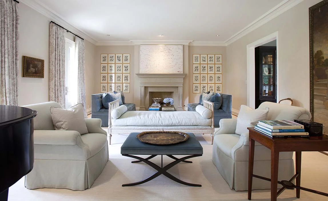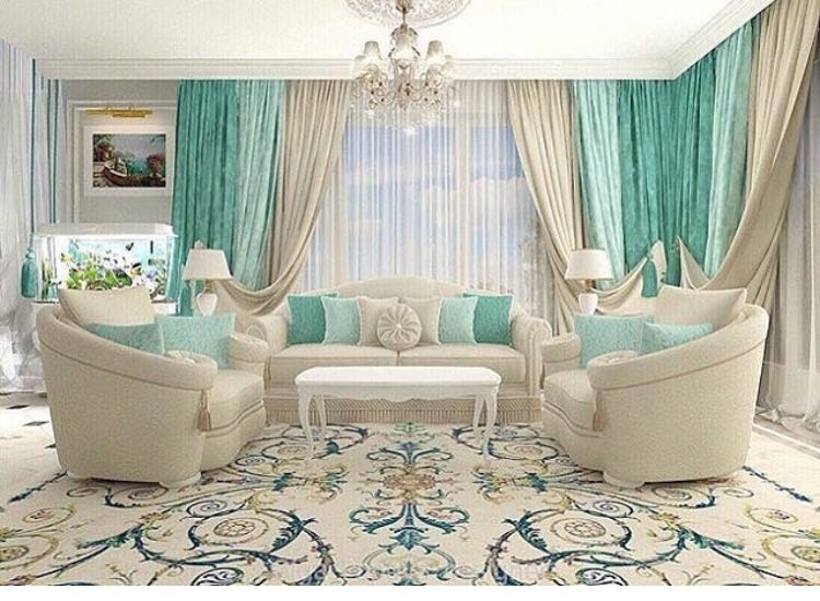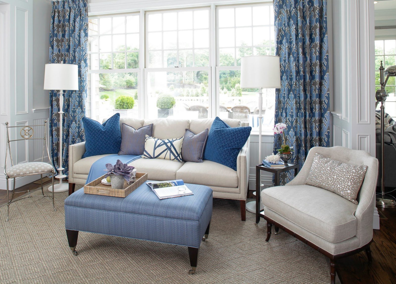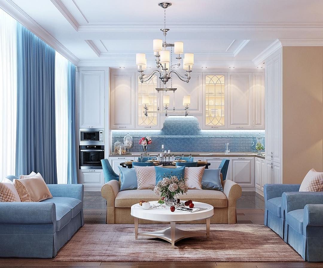 В сочетании с белым и бежевым голубой поможет создать элегантный и сбалансированный интерьер в зоне приёма гостей.
