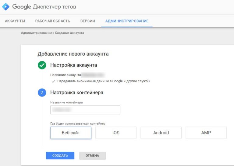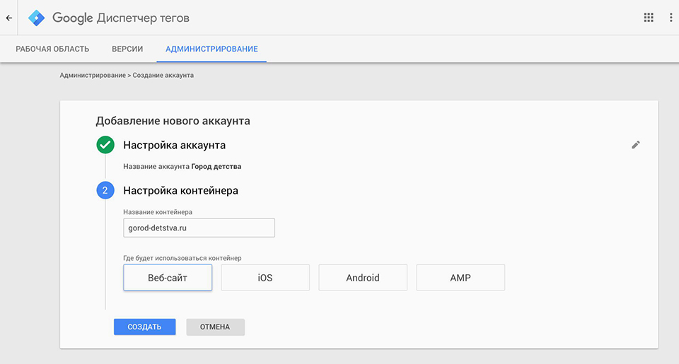 Работа в GTM ведется через аккаунт. В аккаунте создаются контейнеры.