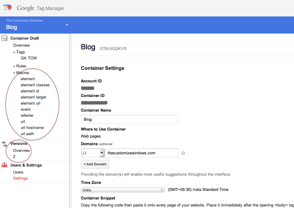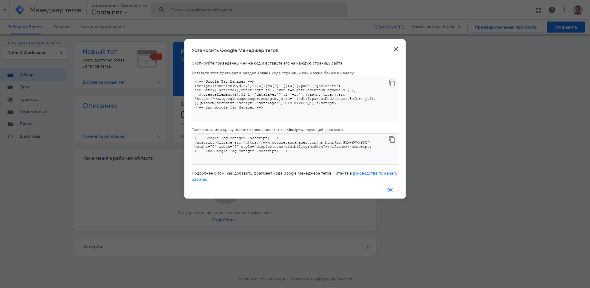 Говоря простыми словами, контейнер – это кусочек кода, в который мы помещаем тэги. Затем теги из контейнера загружаются и выполняются. Как только вы зарегистрируетесь в GTM, вы сразу увидите код контейнера. Посмотреть его можно также по следующему пути: