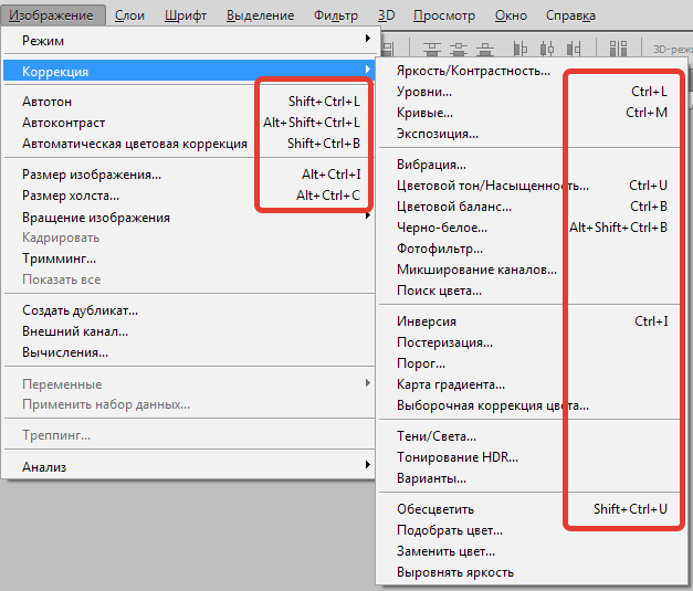 Кстати, некоторые горячие клавиши можете увидеть напротив тех или иных пунктов меню фотошопа.