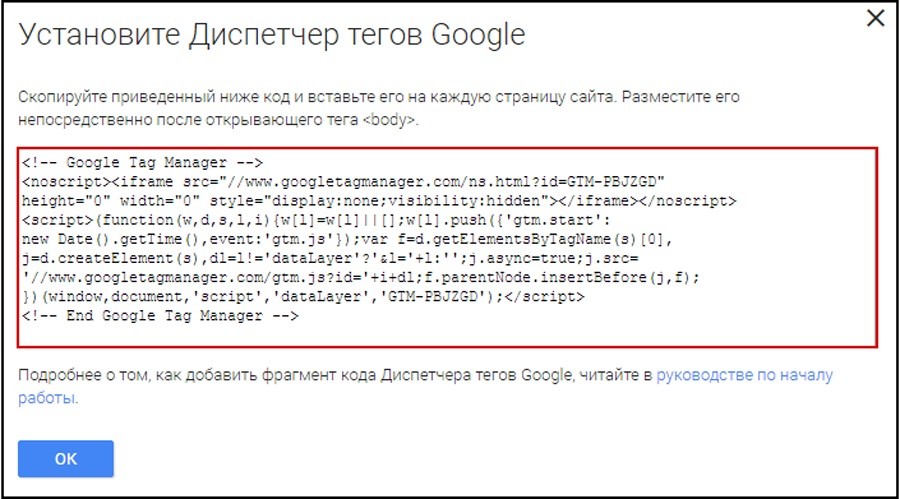 - Контейнер. Оболочка, под которой сохранены все теги ресурса. Отсюда можно брать код, который используется на сайте для активации тегов.
