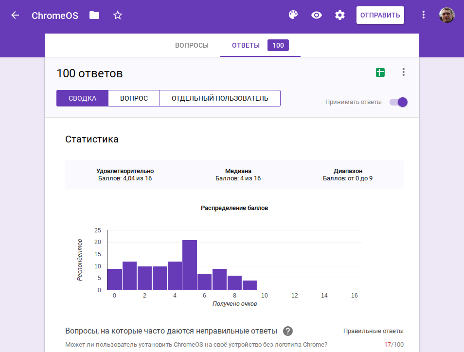 Разместить созданную форму можно на личном или корпоративном сайте, в своем аккаунте в социальных сетях или отправить по е-почте. Когда соберёте необходимое количество ответов, форму можно закрыть. Для этого перейдите в закладку «Ответы» и передвиньте ползунок: