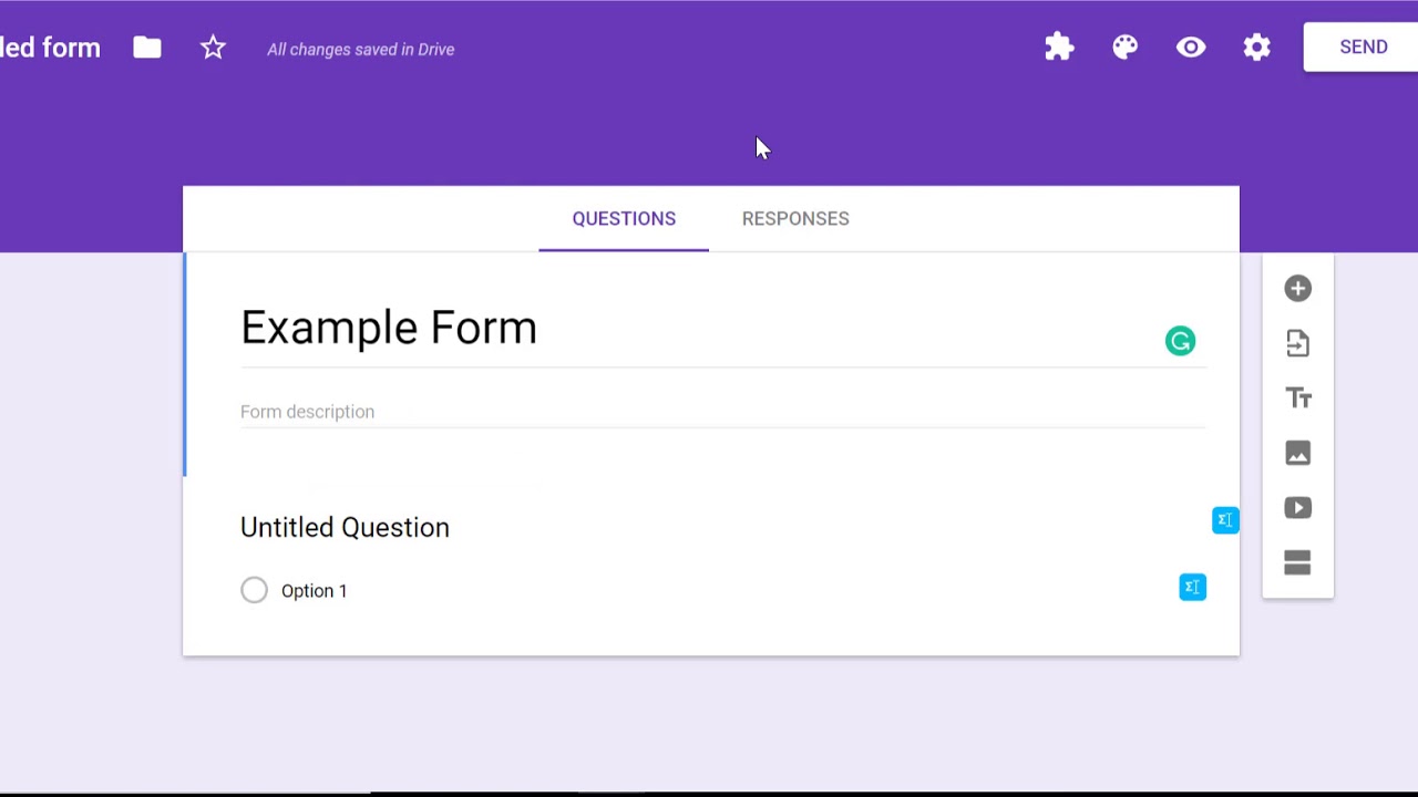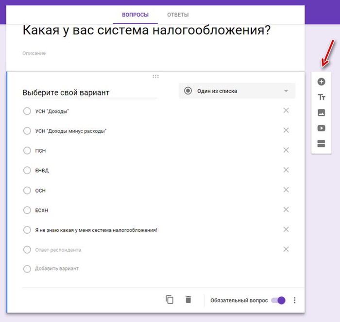 Используйте боковое меню, чтобы добавить вопрос, раздел, изображение или видео. Здесь вы также можете импортировать вопросы из любой ранее использованной формы Google с Google Диска.