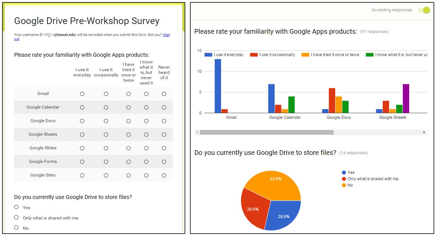 Вы можете получить доступ к ответам на опрос в редакторе форм. Щелкнув по меню Responses вверху в центре страницы, вы найдете сводку накопленных данных, которая разбита по отдельным вопросам и отдельным респондентам.