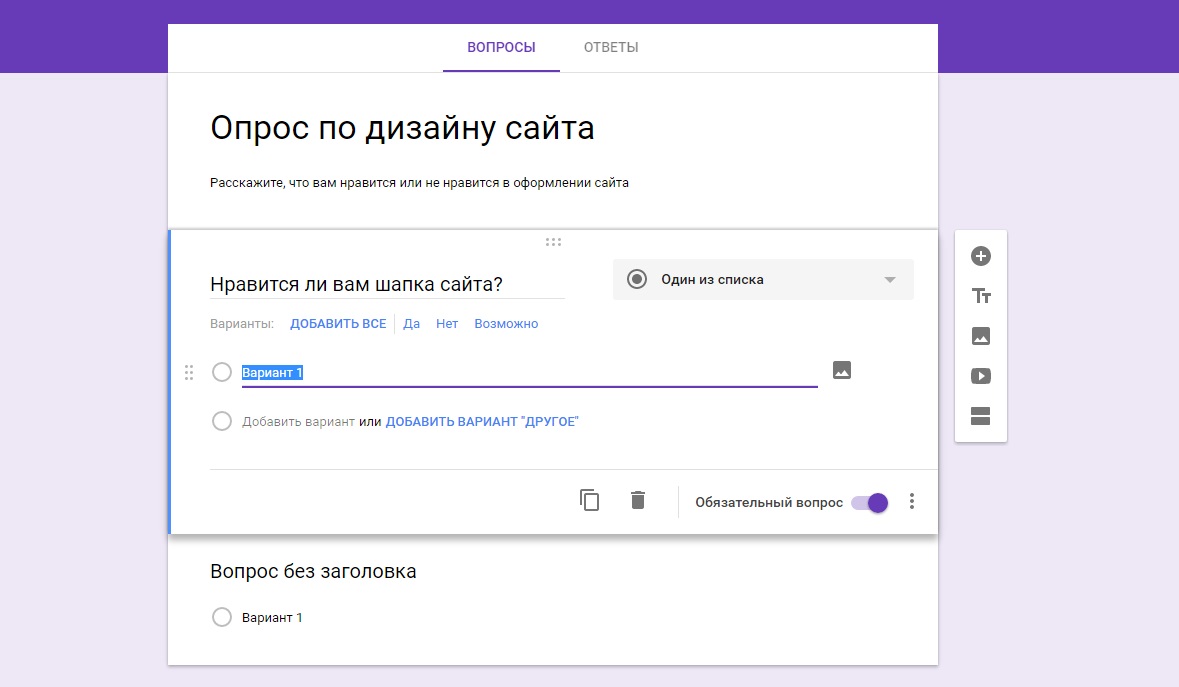 Простой опрос создается за пару кликов, даже создавая форму с телефона вы не столкнетесь с трудностями.