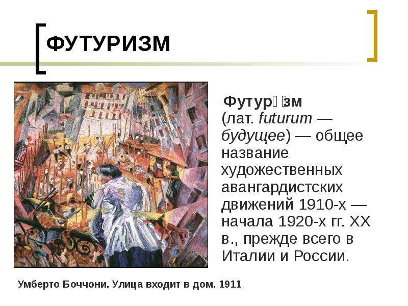 Футуризм родился в период потрясений как революционное движение , которое стремилось обновить каждую форму искусства , чтобы идти в ногу с технологическими и промышленными инновациями , которые появлялись.Футуризм подчеркивал скорость, технологии, молодость и насилие. и вещи, воплощающие эти качества, такие как автомобиль, самолет и промышленный город в целом. Традиции прошлого пришлось оставить позади, чтобы сосредоточить внимание на динамичном настоящем .