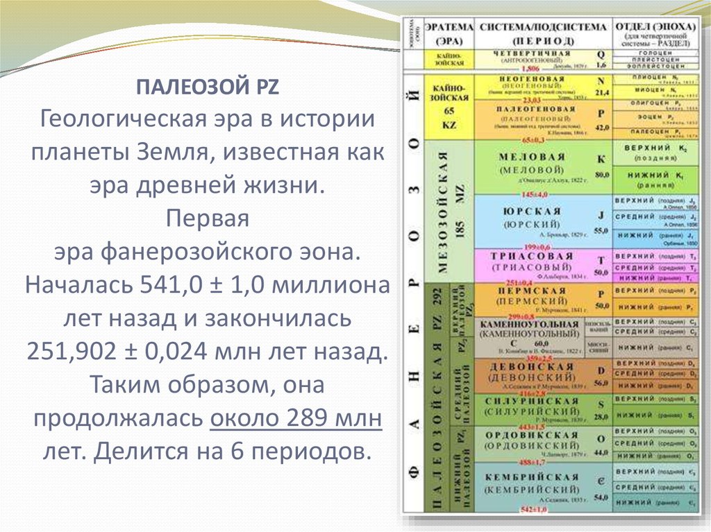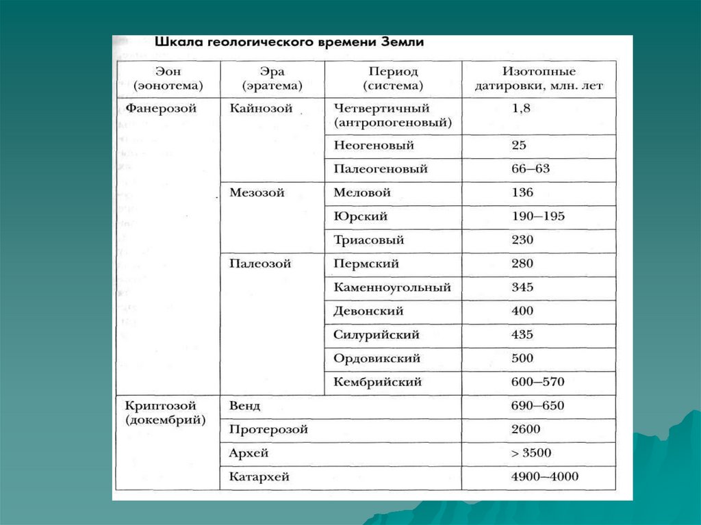 При изучении геологической истории Земли принято использовать такие понятия, как геологические эры, периоды. Эра — наиболее крупный период развития Земли, соответствующий времени образования определенного типа горных пород. Эры принято делить на периоды.