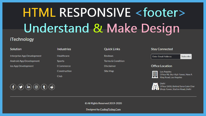 Нижний колонтитул с адаптивным дизайном в HTML считается визуально привлекательным, функциональным и удобным для использования независимо от того, с какого устройства пользователь получает к нему доступ. Адаптивный дизайн нижнего колонтитула делает любой сайт идеальным и красивым. Он изменяет свой размер вместе с компонентами в нем в зависимости от того, с какого устройства его посещают.