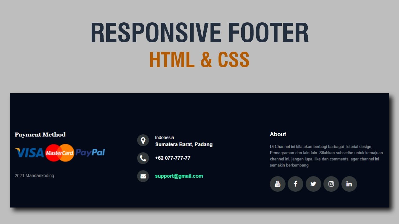 В этом дизайне нижнего колонтитула в HTML внизу веб-страницы есть раздел, содержащий некоторые основные описания. Под описанием есть пять иконок социальных сетей .