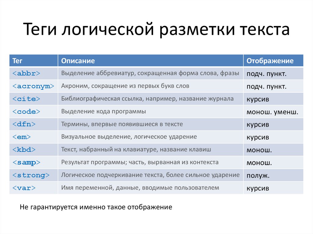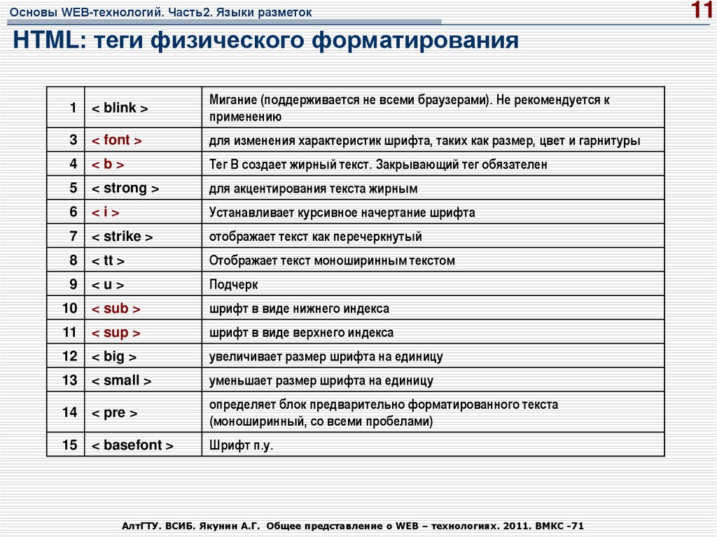 - tt — выводит текст моноширинным шрифтом. Не несет в себе смысловой нагрузки. Моноширинный означает, что для всех символов шрифта ипользуется одинаковое пространство при написании.
