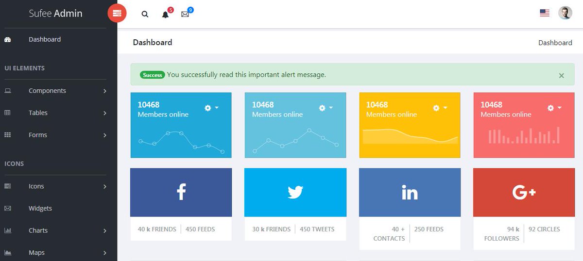 Выберите из различных цветовых схем и множества других вариаций, чтобы получить именно то, что вы хотите. Благодаря передовой платформе Bootstrap он также соответствует всем последним веб-стандартам. Благодаря интеграции MailChimp и Campaign Monitor управлять электронной почтой и собирать ее очень просто. Кроме того, чтобы вы могли начать работу, он поставляется с шаблонами для «Скоро», «Страница входа», «Страницы ошибок 400 и 500». Еще один вариант, из которого вы можете выбрать неограниченное количество боковых панелей. Вы также можете связать свои социальные платформы со всеми популярными значками социальных сетей.