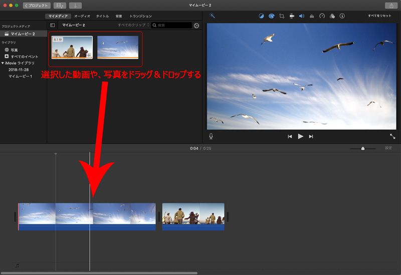 Когда ваш проект будет готов, нажмите кнопку «Импортировать медиа», чтобы добавить видео, аудио и фотографии. После этого перетащите импортированное видео на временную шкалу iMovie (нижнее окно в интерфейсе.