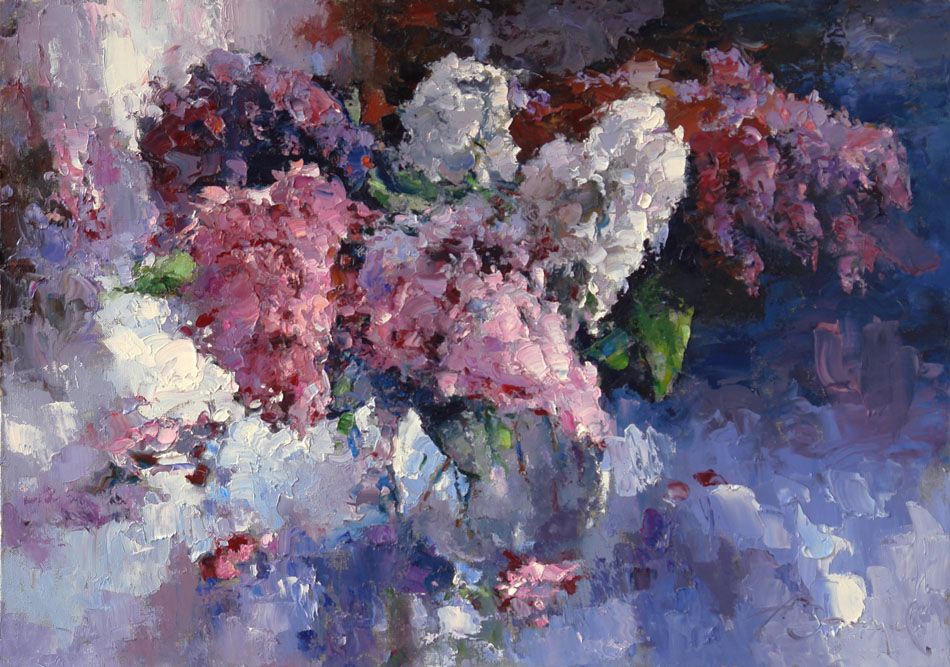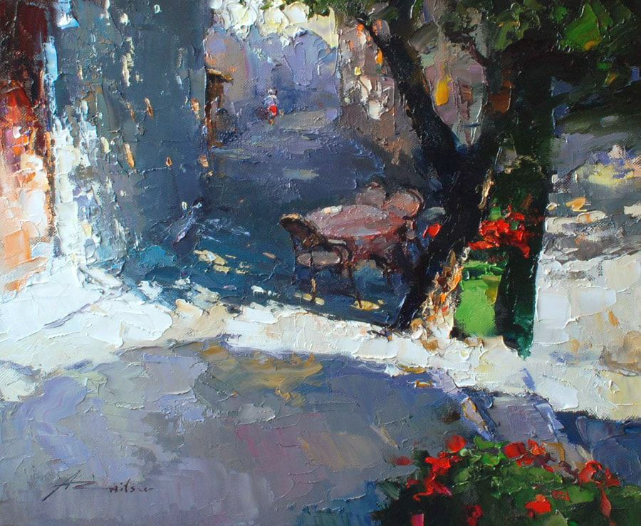 Мастер будто достаёт из тюбиков не краску, а солнечных «зайчиков» и рассаживает в нужном порядке на своих холстах. Каких-то он собирает в кучки, а каких-то оставляет в гордом королевском одиночестве: всё зависит от композиции.
