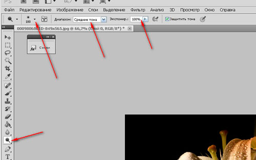 ΠΡΠΈ ΡΠΆΠΈΠ³Π°Π½ΠΈΠΈ ΡΠΎΡΠΎΠ³ΡΠ°ΡΠΈΠΈ Ρ ΠΏΠΎΠΌΠΎΡΡΡ ΠΈΠ½ΡΡΡΡΠΌΠ΅Π½ΡΠ° Β«ΠΠ°ΡΠ΅ΠΌΠ½ΠΈΡΠ΅Π»ΡΒ» (O) ΠΎΠ±Π»Π°ΡΡΡ Π·Π°ΡΠ΅ΠΌΠ½ΡΠ΅ΡΡΡ, Π° ΠΏΡΠΈ ΠΎΡΠ²Π΅ΡΠ»Π΅Π½ΠΈΠΈ ΡΠΎΡΠΎΠ³ΡΠ°ΡΠΈΠΈ Ρ ΠΏΠΎΠΌΠΎΡΡΡ ΠΈΠ½ΡΡΡΡΠΌΠ΅Π½ΡΠ° Β«ΠΡΠ²Π΅ΡΠ»Π΅Π½ΠΈΠ΅Β» (O) ΡΡΠ° ΠΎΠ±Π»Π°ΡΡΡ ΠΎΡΠ²Π΅ΡΠ»ΡΠ΅ΡΡΡ.ΠΡ ΠΌΠΎΠΆΠ΅ΡΠ΅ Π½Π°ΡΡΡΠΎΠΈΡΡ ΡΠΎΠ½Π°Π»ΡΠ½ΡΠΉ Π΄ΠΈΠ°ΠΏΠ°Π·ΠΎΠ½, Π½Π° ΠΊΠΎΡΠΎΡΡΠΉ Π²Π»ΠΈΡΠ΅Ρ ΠΊΠ°ΠΆΠ΄ΡΠΉ ΠΈΠ½ΡΡΡΡΠΌΠ΅Π½Ρ, ΠΈΠ·ΠΌΠ΅Π½ΠΈΠ² Π½Π°ΡΡΡΠΎΠΉΠΊΡ Β«ΠΠΈΠ°ΠΏΠ°Π·ΠΎΠ½Β» Π² ΡΠ°ΡΠΊΡΡΠ²Π°ΡΡΠ΅ΠΌΡΡ ΠΌΠ΅Π½Ρ ΡΡΡΠΎΠΊΠΈ ΠΌΠ΅Π½Ρ. ΠΠ±Π° ΠΈΠ½ΡΡΡΡΠΌΠ΅Π½ΡΠ° Burn Tool ΠΈ Dodge Tool ΠΈΠΌΠ΅ΡΡ ΡΡΠΈ Π½Π°ΡΡΡΠΎΠΉΠΊΠΈ Π΄ΠΈΠ°ΠΏΠ°Π·ΠΎΠ½Π°: Highlights, Midtones ΠΈ Shadows. ΠΡ ΡΠ°ΠΊΠΆΠ΅ ΠΌΠΎΠΆΠ΅ΡΠ΅ Π½Π°ΡΡΡΠΎΠΈΡΡ ΠΈΠ½ΡΠ΅Π½ΡΠΈΠ²Π½ΠΎΡΡΡ ΠΈΠ½ΡΡΡΡΠΌΠ΅Π½ΡΠ°, ΠΈΠ·ΠΌΠ΅Π½ΠΈΠ² Π΅Π³ΠΎ Π½Π°ΡΡΡΠΎΠΉΠΊΡ Β«ΠΠΊΡΠΏΠΎΠ·ΠΈΡΠΈΡΒ».