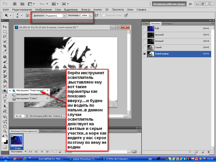 Π’Π΅Ρ Π½ΠΈΡΠ΅ΡΠΊΠΎΠ΅ ΠΏΡΠΈΠΌΠ΅ΡΠ°Π½ΠΈΠ΅: ΠΡΠ»ΠΈ Π²Ρ ΠΏΠΎΠΏΡΡΠ°Π΅ΡΠ΅ΡΡ ΠΎΡΠ²Π΅ΡΠ»ΠΈΡΡ ΡΠ΅ΠΌΠ½ΡΡ ΠΎΠ±Π»Π°ΡΡΡ ΡΠ΅Π½ΠΈ Ρ ΠΏΠΎΠΌΠΎΡΡΡ ΠΈΠ½ΡΡΡΡΠΌΠ΅Π½ΡΠ° Dodge Tool, ΡΡΡΠ°Π½ΠΎΠ²Π»Π΅Π½Π½ΠΎΠ³ΠΎ Π½Π° Β«Π’Π΅Π½ΠΈΒ», Π²Ρ ΡΠ°Π·ΠΌΠΎΠ΅ΡΠ΅ ΡΡΡ ΠΎΠ±Π»Π°ΡΡΡ, ΡΠ½ΠΈΡΡΠΎΠΆΠΈΠ² ΡΡΠΎΠ²Π½ΠΈ ΡΠ΅ΡΠ½ΠΎΠ³ΠΎ. Π Π½Π°ΠΎΠ±ΠΎΡΠΎΡ, Π΅ΡΠ»ΠΈ Π²Ρ ΠΏΠΎΠΏΡΡΠ°Π΅ΡΠ΅ΡΡ Π·Π°ΡΠ΅ΠΌΠ½ΠΈΡΡ ΡΠ²Π΅ΡΠ»ΡΡ ΠΎΠ±Π»Π°ΡΡΡ Ρ ΠΏΠΎΠΌΠΎΡΡΡ Burn Tool, ΡΡΡΠ°Π½ΠΎΠ²Π»Π΅Π½Π½ΠΎΠ³ΠΎ Π½Π° Β«HighlightsΒ», Π²Ρ Π·Π°ΠΏΡΡΠ°Π΅ΡΠ΅ ΡΠ²Π΅ΡΠ»ΡΠ΅ ΠΎΠ±Π»Π°ΡΡΠΈ ΠΈ ΠΏΠΎΡΠ΅ΡΡΠ΅ΡΠ΅ ΠΏΡΠ°Π²ΠΈΠ»ΡΠ½ΡΡ ΡΠΎΡΠΊΡ Π±Π΅Π»ΠΎΠ³ΠΎ Π² ΡΠ²Π΅ΡΠ»ΡΡ ΡΡΠ°ΡΡΠΊΠ°Ρ .